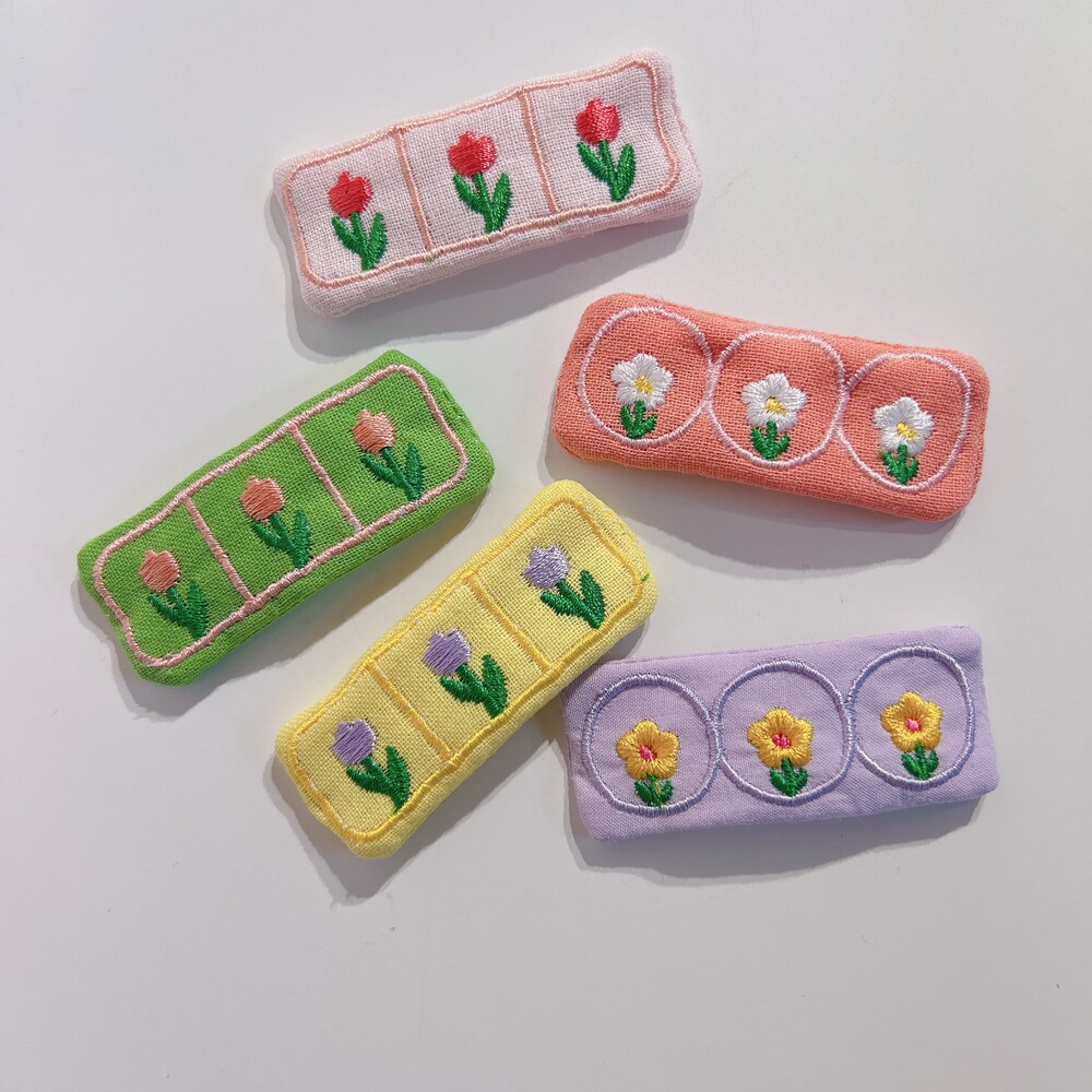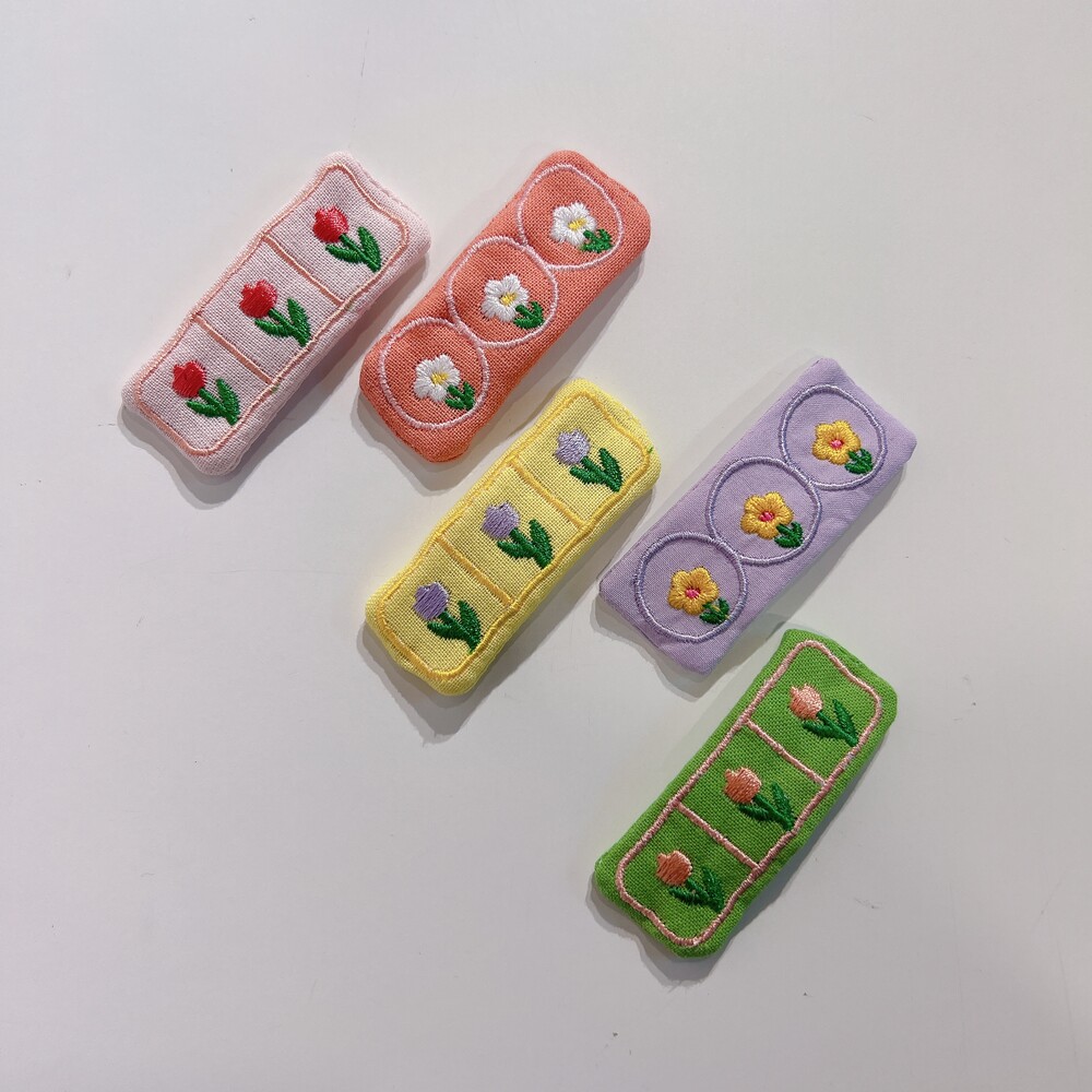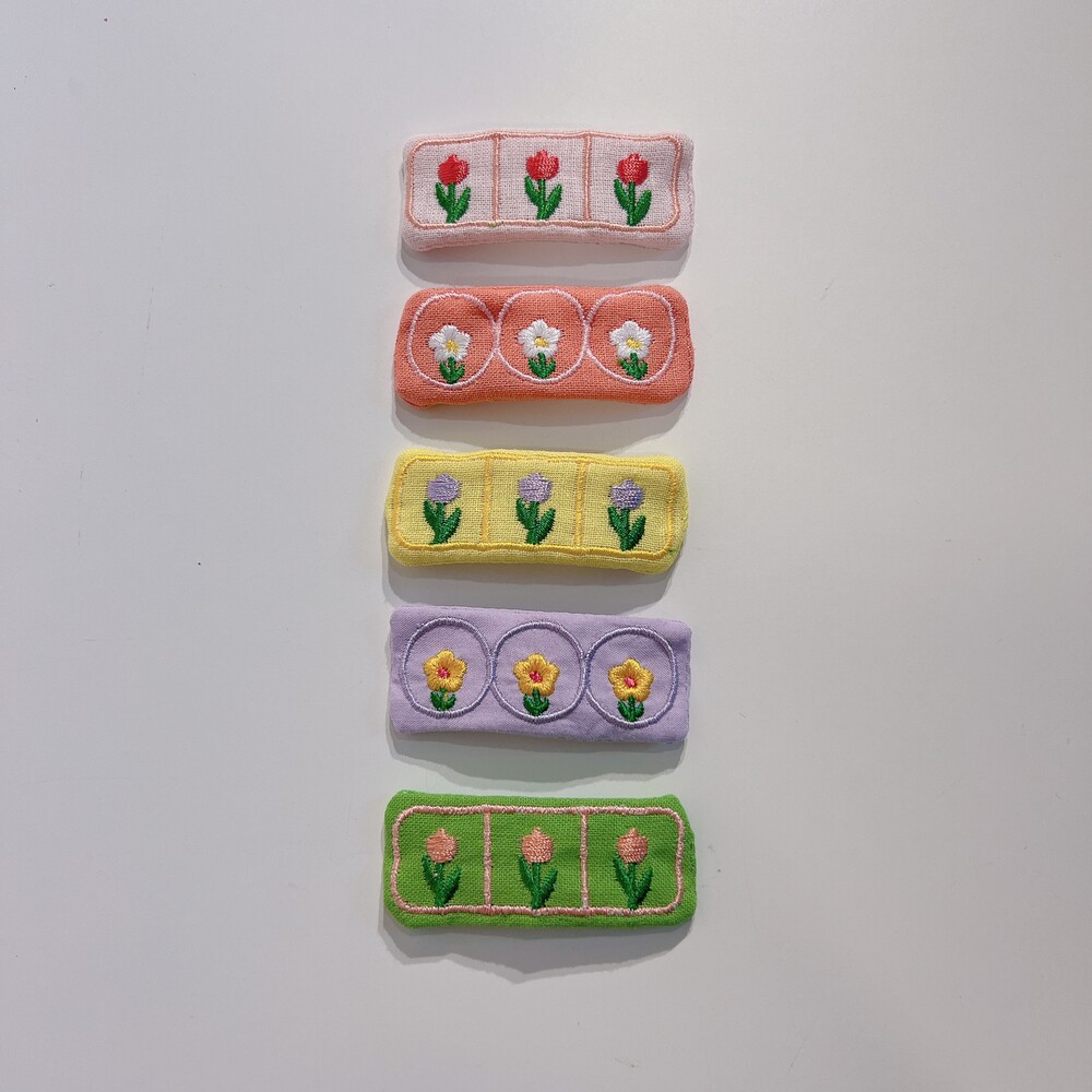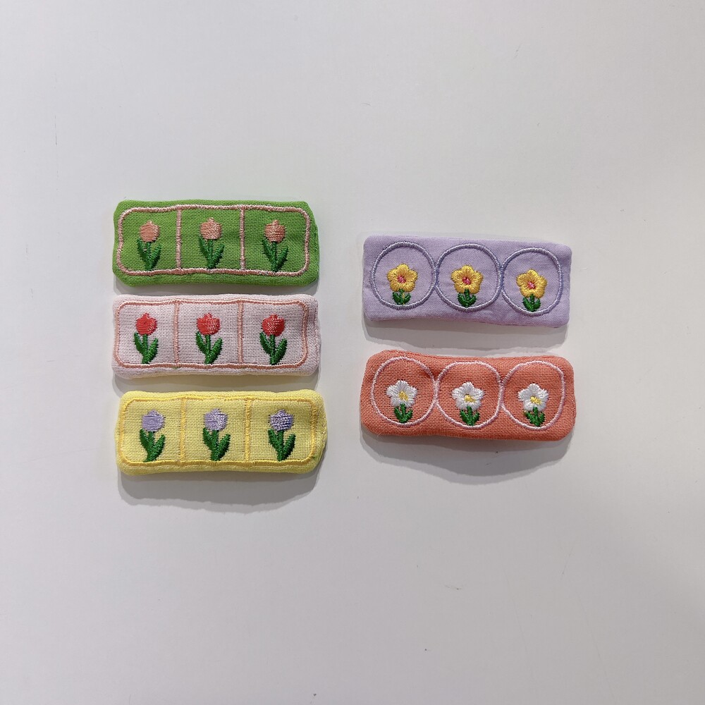 예쁜 컬러의 원단에 툴립 or 데이지 자수가 놓여진