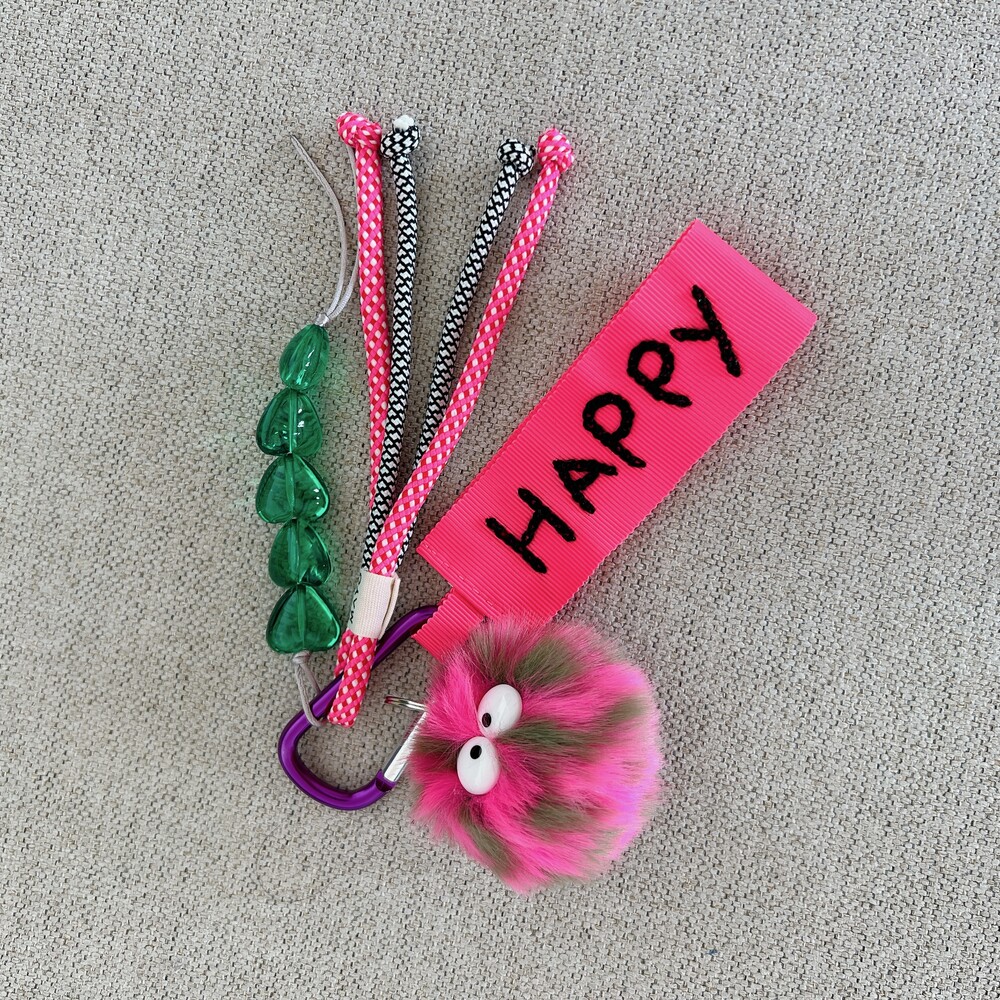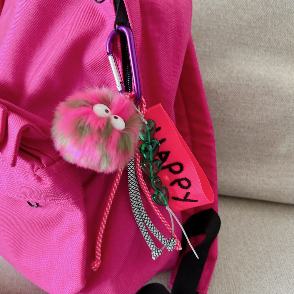 네온핑크 네임택 + 핑크&카키 먼지몽 + 초록 하트참
