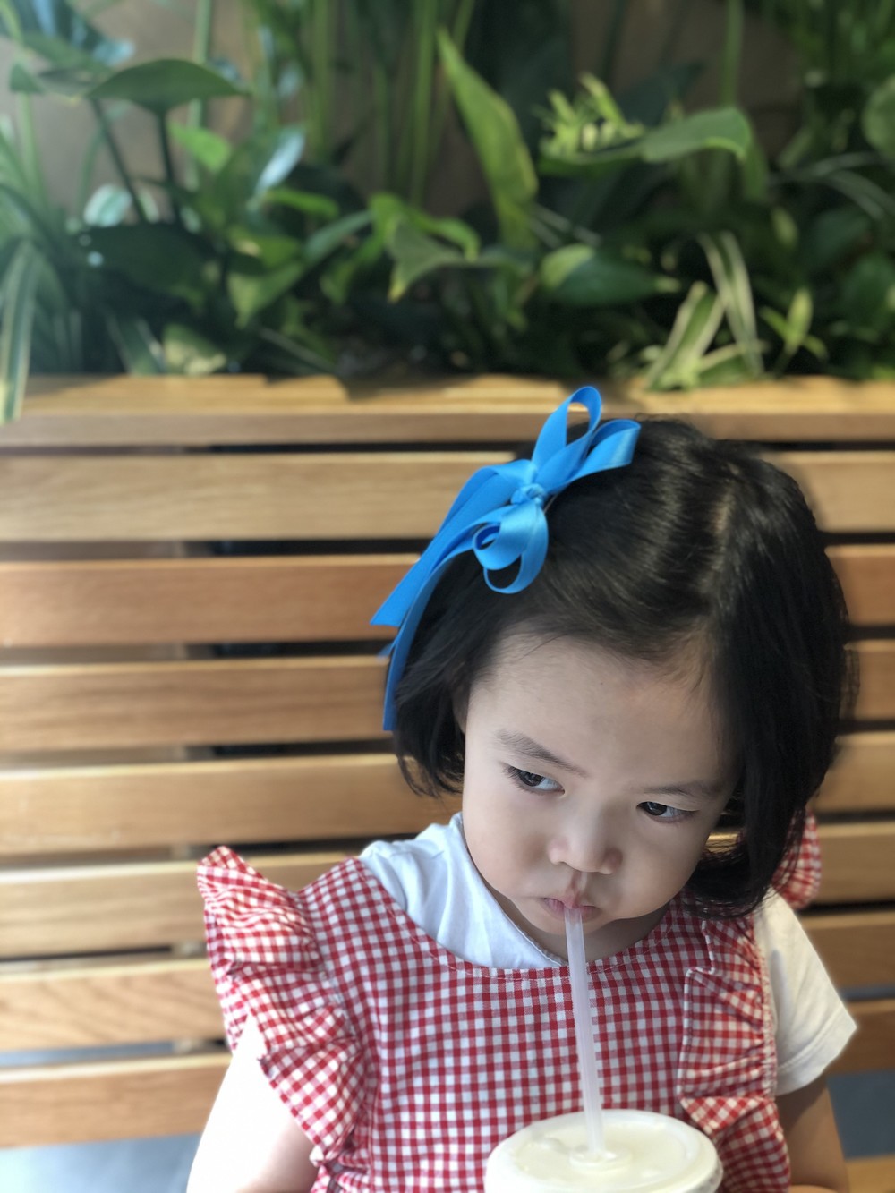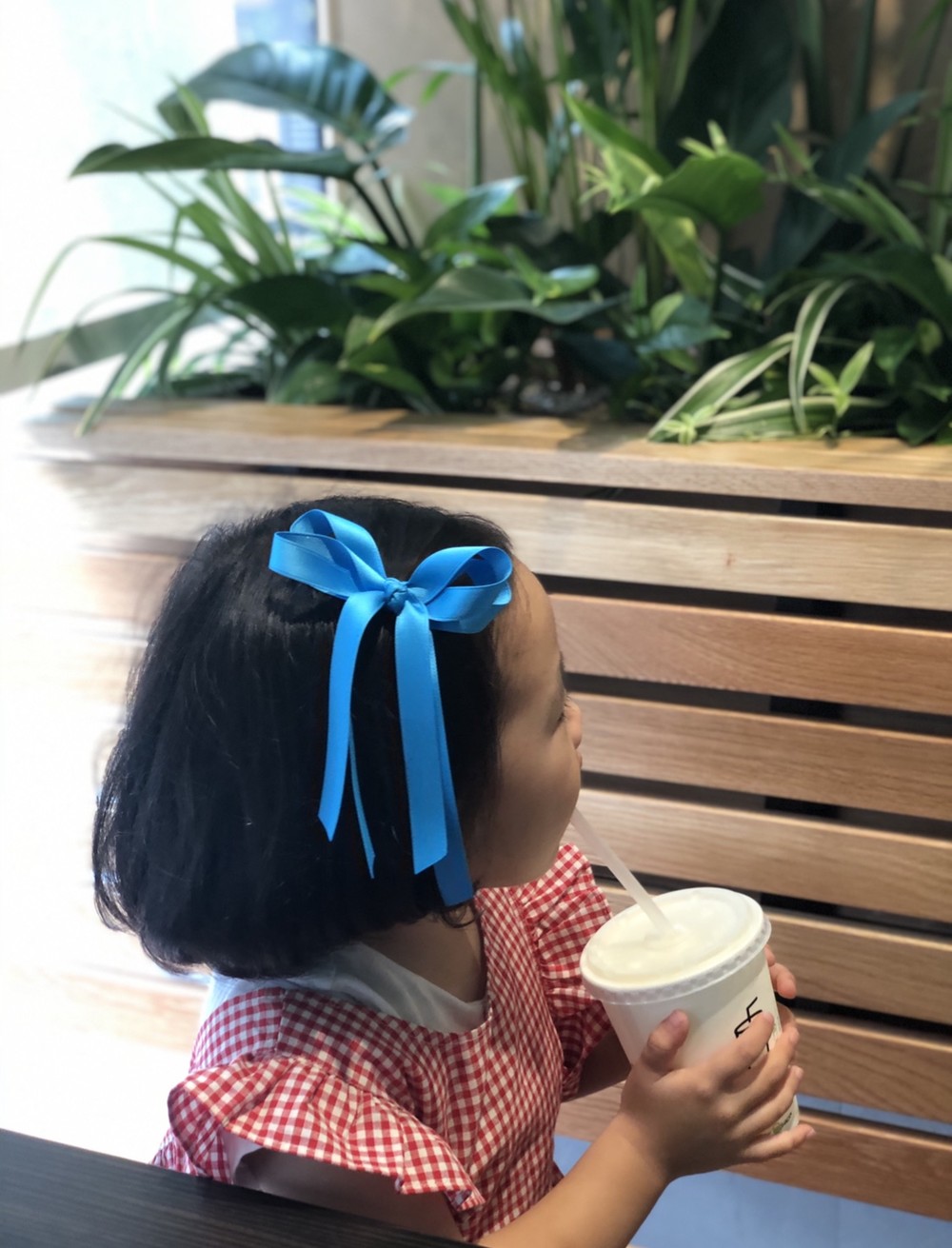 어느날 포니테일에 파란 리본을 늘어뜨린